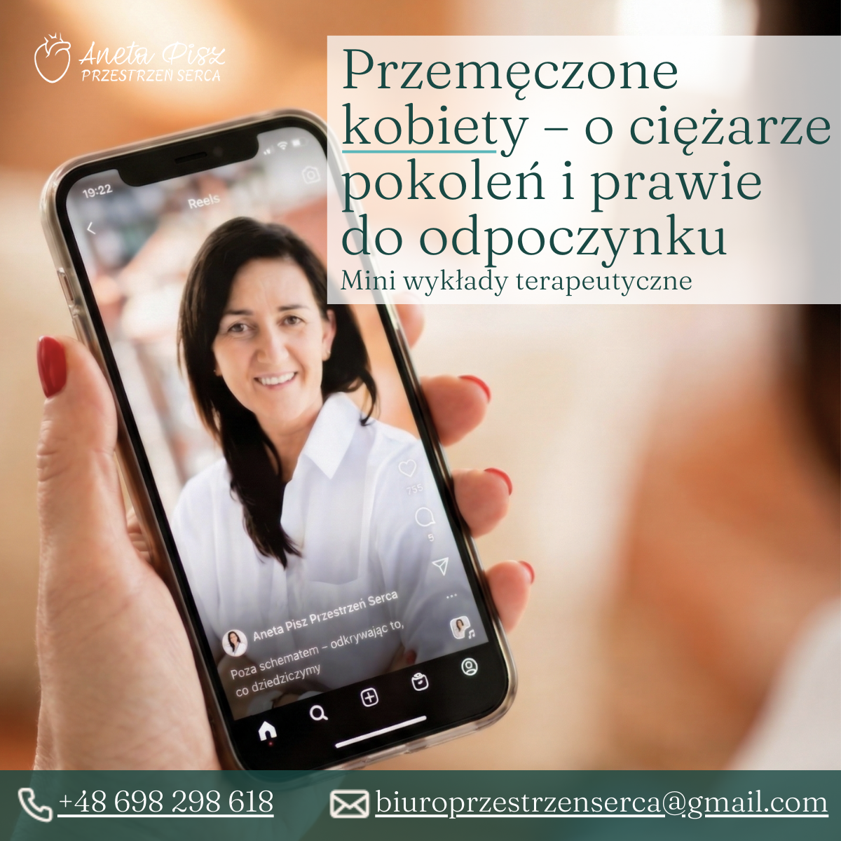 Aneta Pisz – psychoterapeutka, założycielka „Przestrzeni Serca” i „Centrum Terapii Rodzin” w Katowicach. Od ponad 20 lat towarzyszy ludziom w procesach głębokiej przemiany i odzyskiwania wewnętrznego spokoju. Łączy wiedzę kliniczną, psychoterapeutyczną z holistycznym podejściem do człowieka – uwzględniając emocje, ciało, relacje i pamięć międzypokoleniową. W swojej autorskiej metodzie łączy ustawienia systemowe, Terapię Mocnego Trzymania, podejście ericksonowskie, a także elementy pracy z ciałem, oddechem i aromaterapią. Specjalizuję się w terapii rodzin i par, a także w pracy z osobami w trudnych doświadczeniach życiowych: w obszarze niepłodności, in vitro, poronień, żałoby, oraz w pracy z młodzieżą doświadczającą kryzysów emocjonalnych i autoagresji. Towarzyszy również w procesach związanych z traumami międzypokoleniowymi i złożoną dynamiką systemów rodzinnych.